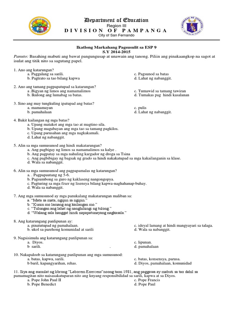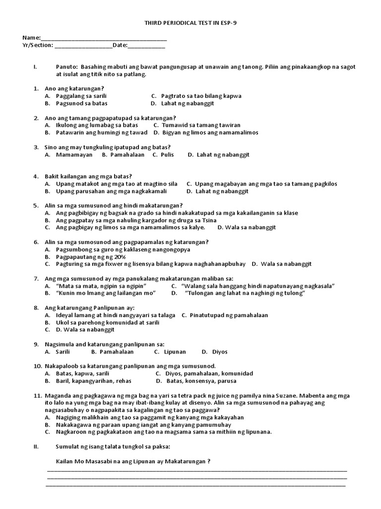 Esp9 Pagtataya Ikatlong Markahan Pagtataya Sa Esp 9 Katarungang Panlipunan Panuto Basahing Mabuti Ang Bawat Pangungusap At Unawain Ang Tanong Course Hero
