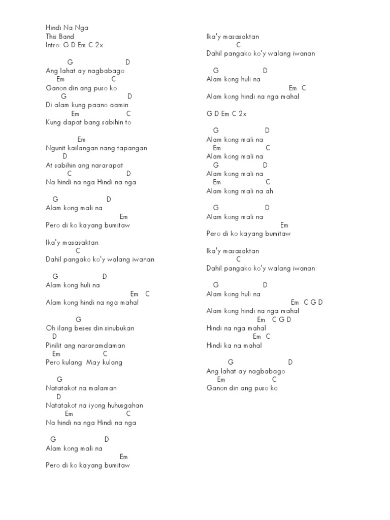 Alam kong hindi na nga mahal. Di alam kung paano aamin Kung dapat bang sabihin to Ngunit kailangan nang tapangan At sabihin ang nararapat Na hindi na nga Hindi na nga Alam kong mali na Pero di ko kayang bumitaw Ikay masasaktan Dahil pangako koy walang iwanan Alam kong huli na Alam kong hindi na nga mahal Oh ilang beses din sinubukan Pinilit ang nararamdaman Pero kulang. 2018 ----- Hindi Na Nga This Band Lyrics Video HINDI NA NGA Lyrics Ang lahat ay nagbabago Ganun din ang puso ko Di alam kung pano aamin Kung.