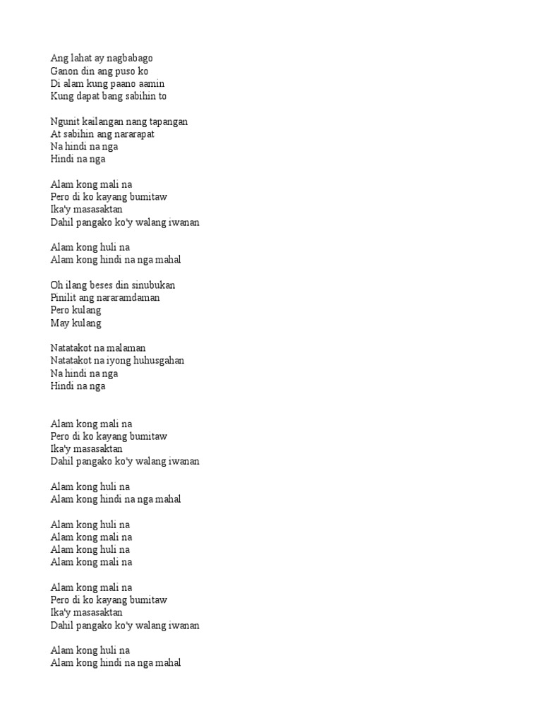 10032019 Di alam kung paano aamin. Ngunit kailangan nang tapangan. Alam kong huli na Alam kong hindi na nga mahal Verse 2 Oh ilang beses din sinubukan Pinilit ang nararamdaman Pero kulang may kulang Pre-Chorus 2 Natatakot na malaman Natatakot na iyong huhusgahan Na hindi na nga hindi na nga Chorus Alam kong mali na Pero di ko kayang bumitaw Ikay masasaktan Dahil pangako koy walang iwanan Alam kong huli na.