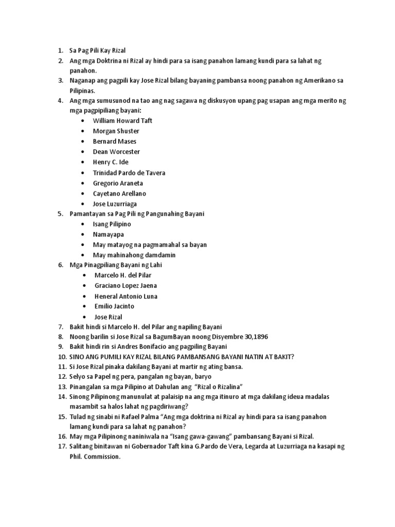 Si Rizal ay hindi lamang ANG PINAKABANTOG NA TAO SA KANYANG MGA KABABAYAN KUNDI ANG PINAKA-DAKILANG TAO NA NALIKHA NG LAHING MALAYO. Sa sanaysay ni Rizal mapapatunayan na maaring magkaroon ng sulyap sa hinaharap kung babalikan ang nakaraan. Gobernador sibil william howard taft sa ilalim ng pamamahala ni _______________ naganap ang pagpili kay rizal bilang bayani.