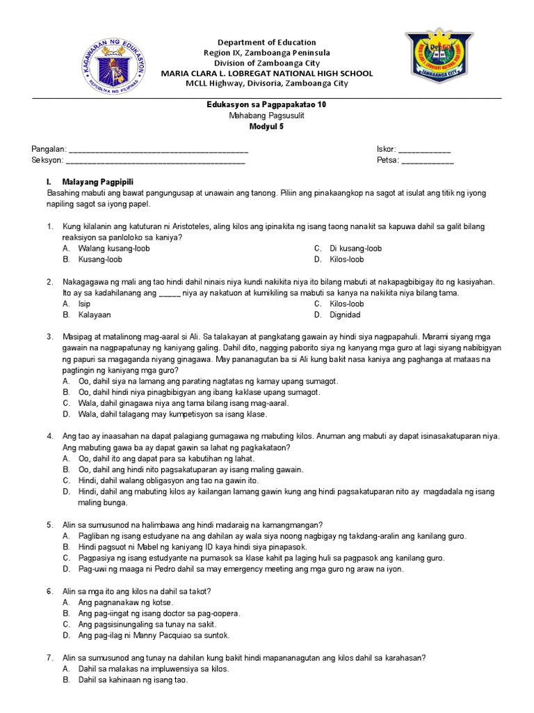 Esp 10 Docx Matalam Polytechnic College Inc Poblacion Matalam Cotabato Ikalawang Markahang Pagsusulit Sa Edukasyon Sa Pagpapakatao 10 Pangalan Petsa Course Hero