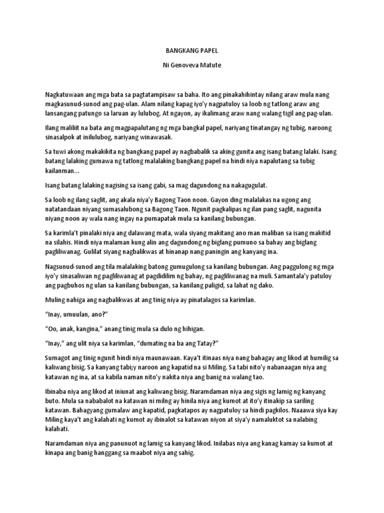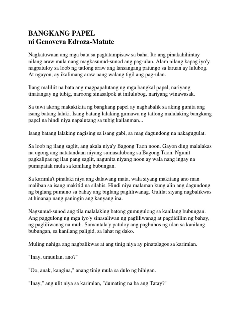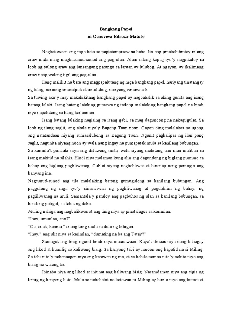 Maikling Kwento BANGKANG PAPEL ni Genoveva Edroza-Matute TAGPUAN Lugar o Pinangyarihan. Isang batang lalaking gumawa ng tatlong malalaking bangkang papel na hindi niya napalutang sa tubig kailanman. Isang batang lalaking gumawa ng tatlong malalaking bangkang papel na hindi niya napalutang sa tubig kailanman.
