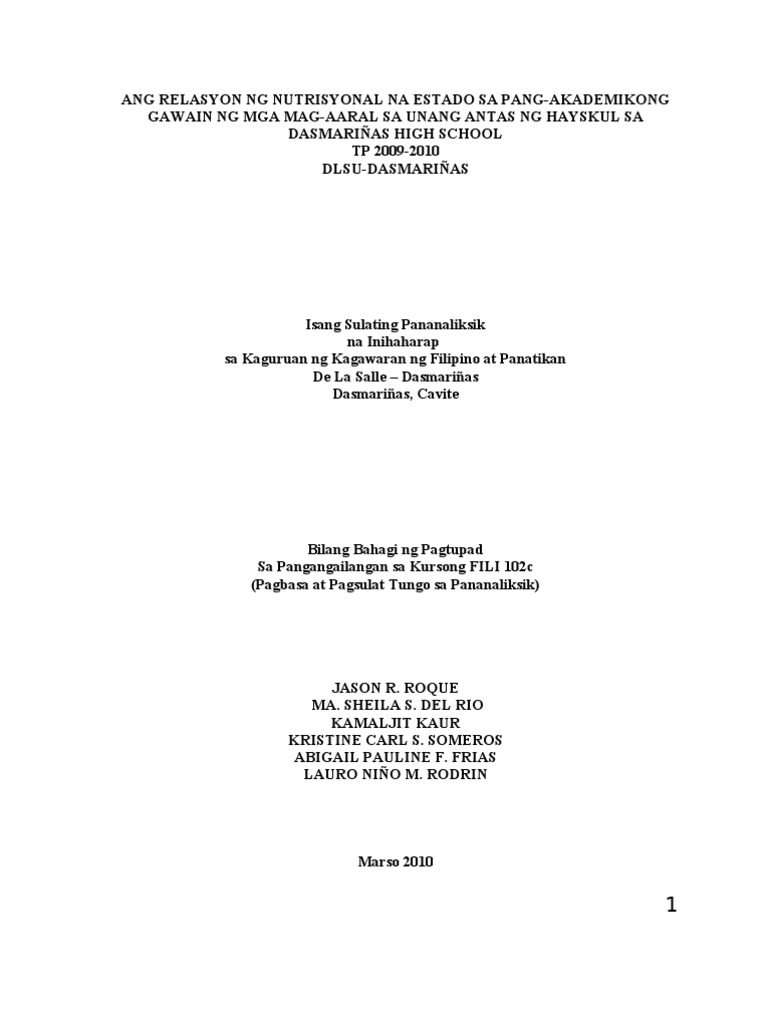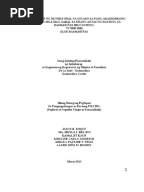 Ang Relasyon Ng Nutrisyonal Na Estado Sa Pang Akademikong Gawain Ng Mga Mag Aaral Sa Unang Antas Ng Hayskul Sa Dasmarinas High School