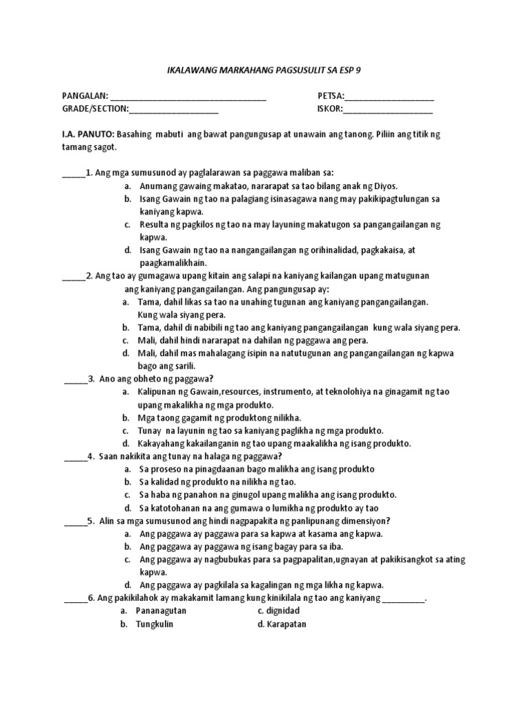 Ikalawang Markahang Pagsusulit Sa Esp 9 T Angie