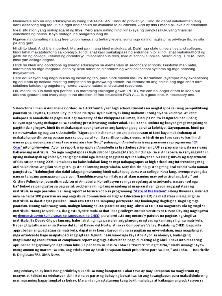 Danika Palanca Uncategorized July 24 2018 1 Minute. Napanood ko sa balita kanina na sa susunod na taon ay nagbabadyang tumaas na naman ang tuition fees sa ibat ibang unibersidad at kolehiyo at dahil dito maaring dumami na naman ang. 12062013 Sa madaling sabi ANG EDUKASYON AY KARAPATAN AT HINDI ISANG PRIBILEHIYO.